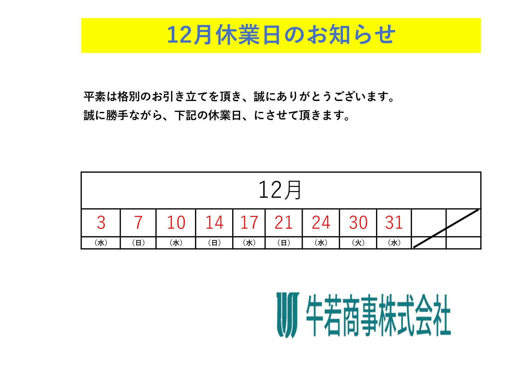 眞に勝手ながら、年末年始の業務を下記のとおりとさせていただきます。